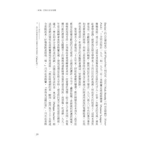 相同的心聲,在兩本定義不列顛現代足球文學的書中也聽得見。彼特.戴維斯(Pete Davies)的《比賽結束》(All Played Out)和尼克.宏比(Nick Hornby)的《足球熱》(Fever Pitch),分別出版於一九九一和一九九二年,英格蘭足球超級聯賽(Premier League,簡稱英超)成立前夕。這兩本書被譽為是現代足球的代言人,自省、告解式的文風,兼具社會學意識,確實為足球文學帶來了不同以往的新風潮,但在更大的程度上,這兩本書其實也是一首獻給舊日足球的輓歌。雖然兩位作者並不懷念一九七○與八○年代的暴力事件和老舊危險的球場,但兩人都推崇當時的氛圍及日漸減少的球迷所展現的集體能量,且他們也都感受到,新商業化的來臨將會讓這一切銷聲匿跡。