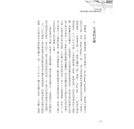 英格蘭足球曾經一路踢出貧民窟,成為熱血澎湃的國民運動,更搖身一變成國內最賺錢的娛樂事業。又為何逐漸在國際賽場上欲振乏力,歧視和對立頻傳、球迷熱情銳減?足球帝國的建立與傾覆,在在都跟英格蘭社會,甚至整個不列顛有關!