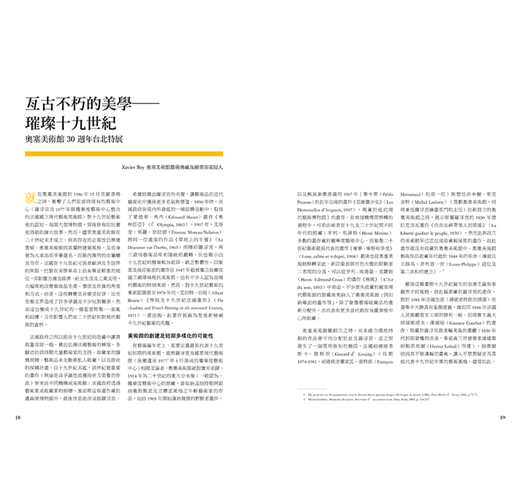 國立故宮博物院非常榮幸迎接「奧塞30週年大展」到來,本展忠實呈現了奧塞典藏作品的年代風格,包含:浪漫主義與古典主義、學院派與寫實主義、印象派與自然主義、象徵主義與折衷主義,以及二十世紀現代藝術之種種起源等流派演變。此展為奧塞美術館對世界觀眾獻上的藝術饗宴,此站同時是本院獻給所有在台灣的觀眾們一份美好分享,在觀展中通往「印象‧左岸」的奧塞美術館,尋訪那段藝術之春,藉由真實作品交會巨匠之眼。希讓歷史經典可與當代或可見的未來對話,藝術與社會的激盪更為洶湧澎拜,進而再有新生與繁衍,是更深遠期許。