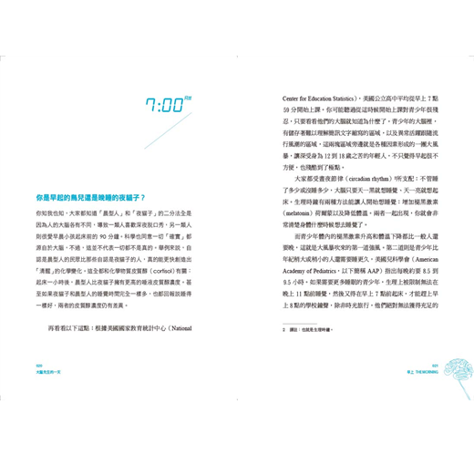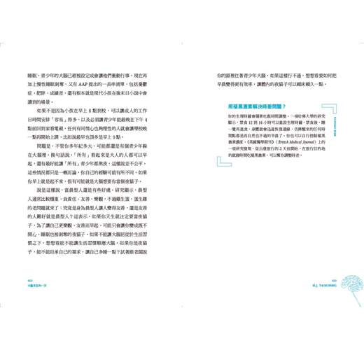 說是這樣說,當晨型人還是有些好處。研究顯示,晨型人通常比較穩重、負責任、友善、樂觀,不過雞生蛋、蛋生雞的老問題就來了:究竟是身為晨型人讓人變得友善,還是友善的人剛好就是晨型人?這表示,如果你天生就注定要當夜貓子,為了讓自己更樂觀、友善而早起,可能只會讓你變成既不開心、睡眠也被剝奪的夜貓子。如果不能讓大腦屈從於生活習慣之下,想想看能不能讓生活習慣順應大腦。如果你是夜貓子,能不能坦承自己的需求,讓自己多睡一點?試著跟老闆說你的頭裡住著青少年大腦,如果這樣行不通,想想看要如何把早晨變得更有效率,讓體內的夜貓子可以賴床賴久一點。