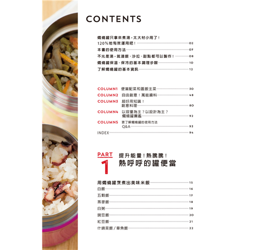 燜燒罐是種可以用來煮飯、製作水煮豆或家常菜、冰涼沙拉或甜點的萬能調理道具。本書將為大家介紹把燜燒罐的保溫、保冷功能發揮到極致的料理及烹調方法的訣竅,以及利用燜燒罐所製作的食材,來製作創意料理的方法。請務必一起享受全新的燜燒罐午餐時光。