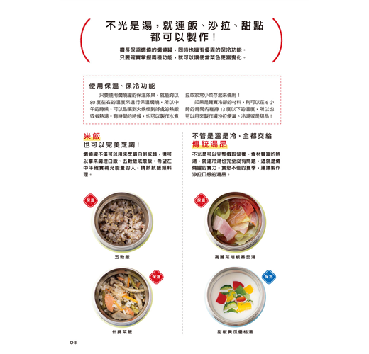 燜燒罐的保溫功能就跟保溫調理器一樣。只要掌握住訣竅,就連白飯、五穀飯、燉飯等都可以一罐搞定。甚至,連相當花費時間烹煮的水煮豆、根莖類蔬菜、乾物的燉煮、溫泉蛋、豆腐,都可以簡單製作,所以燜燒罐能夠以保溫調理器的形式,發揮出最大的功能。