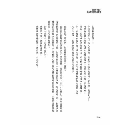 我最喜歡本書提到的:「不一定非得是艱難的改變,才會獲得改變的附帶好事,只要你有勇氣去做出改變或迎接改變,都會帶來好事。」