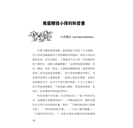 打開《瘋狂樹屋78層:誰是電影大明星?》的書稿,班上那些活蹦亂跳的小男孩瞬間浮現腦海!這些小孩的共通特色是:成天沒事忙,下課總是不見人影,特別懂得珍惜下課時光,就算上課鐘聲響了,也要把握最後關頭,再投一顆球、再抓一隻鬼;上課總是姍姍來遲,課堂間時常恍神(因為思緒常會亂飄),時不時得提醒他們專心。若是他們在課本上振筆疾書,一副用心筆記的模樣,老師也別高興得太早,這多半不是什麼好現象,十之八九簿本上的人物是要倒楣的,不是被畫上濃妝,就是被迫變身。我肯定,這本書根本就是他們的菜!
