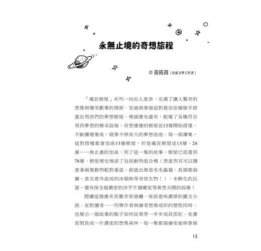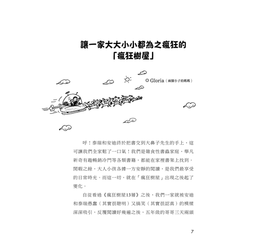 自從看過《瘋狂樹屋13層》之後,我們一家就被安迪和泰瑞愚蠢(其實很聰明)又搞笑(其實很認真)的模樣深深吸引,在反覆閱讀好幾遍之後,五年級的哥哥三天兩頭就提醒媽媽:「查查看下一集出來沒?」等拿到新書,哥哥會在媽媽煮飯的時候說:「媽媽!這一段超好笑的,我念給你聽……」伴隨著抽油煙機大作實在聽不清楚,廚娘忍不住放下鍋鏟看笑話去,母子笑成一團。才六歲的弟弟識字有限,要求媽媽念給他聽,念著念著,媽媽常忍不住笑了起來,接著自顧自的翻頁、翻頁,再翻頁,直到弟弟哀求:「妳不要自己在那裡笑,念給我聽啦!」儘管如此,由於書裡豐富的插圖幀幀精采,大字不識幾個的弟弟就算只看插圖,也能從中嘗到瘋狂樹屋裡特有的樂趣!