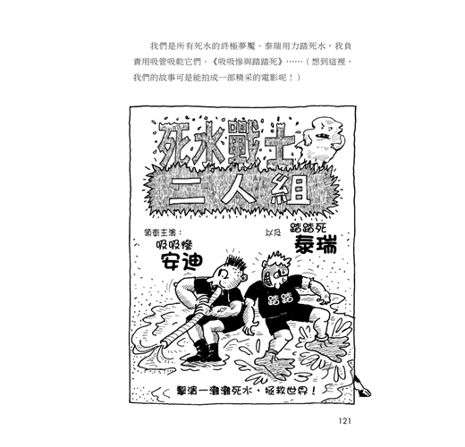 閱讀這個書系其實非常過癮。後設意味濃厚的圖文小說,在對讀者一一列舉作者與繪者想像成形的歷程同時,也展示一個故事的點子如何從萌芽一步步成長茁壯、在書頁間長成一片濃密的想像森林。每一集都描繪安迪與泰瑞怎麼應付他們緊迫的截稿期限,創作出一本新作。書裡由安迪負責撰寫文字、泰瑞負責畫圖,呼應了真實世界中的作、繪者安迪與泰瑞。讀者可以推敲這對創作拍檔多愛拿創作這件事來做文章、玩遊戲。書裡兩位主角的遭遇映照著書外作、繪者創作的經驗,頗有戲中戲、鏡中鏡的趣味與令人莞爾的遐想。