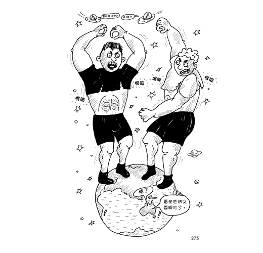 另外一個最大的趣味點當然在於樹屋的一切莫不是竭力在打造男孩的想像宇宙。不曉得大家有沒有看過小男生的塗鴉本?身為兩個小男生的媽媽,我對於孩子的塗鴉本裡經常出現機器人的戰鬥與各式各樣的想像發明非常熟悉。閱讀瘋狂樹屋系列無疑就像看到孩子的想法極大化:比如在《瘋狂樹屋78層:誰是電影大明星》中,出現了一段安迪和泰瑞因為彼此誤解,決定進行空前絕後星際太空爭霸戰的情節。對決刺激無比又高潮迭起。以最快速度巨大化的兩人,把月球當做球踢向對方,用嘴巴接住流星雨發射,拔下土星的光環,將對方的身體切成十二塊,甚至把對手推進超巨大黑洞,使得泰瑞的身體最後因為極端的重力,拉長得就像義大利麵!這段戰鬥的激烈程度與鮮明的視覺意象都讓人印象深刻,就像所有男孩嚮往的宇宙戰鬥大冒險在你面前上演!