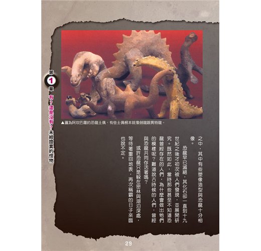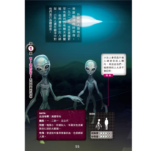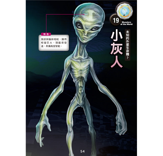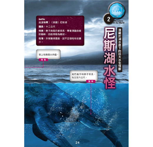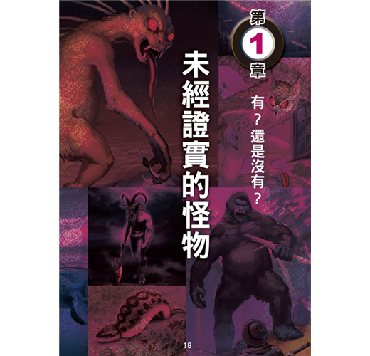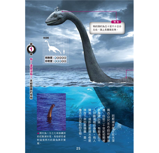 本書詳細記錄各種怪物的體長、特徵、性情、經常出沒的地帶,並以圖示比較一般小學生和怪物大小的差距,抽絲剝繭,一一解開讀者對神祕生物的疑惑。