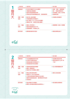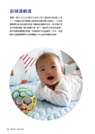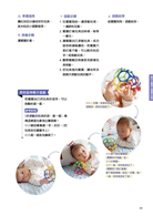 全書針對各月齡寶寶在「身體發展」、「感覺知覺」、「認知」、「語言」、「社交情緒」等五大發展領域,提供新手父母一定要知道的教養知識和適玩遊戲:例如:
