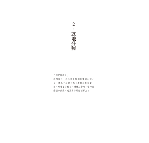 只要沒有新人來,我就是所裡撿破爛的律師。沒人要、看起來又穩輸的案子,都是我的。這天,剛跟被告談完,就接到報社的電話,問我對幾天後將開庭那件社區大案的看法?我憑直覺很有正義感地回答: