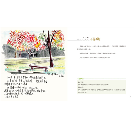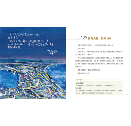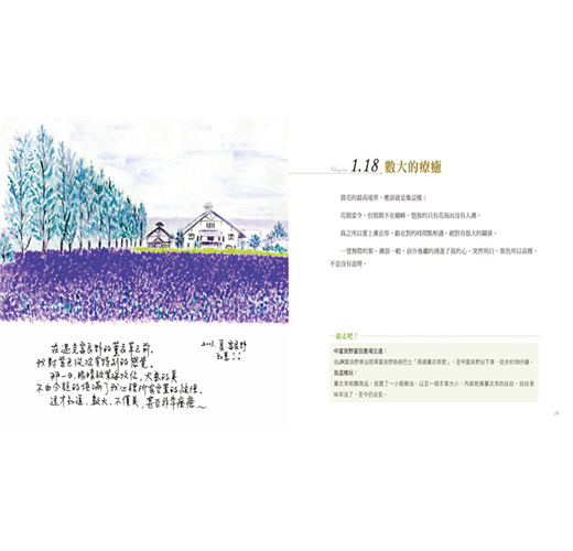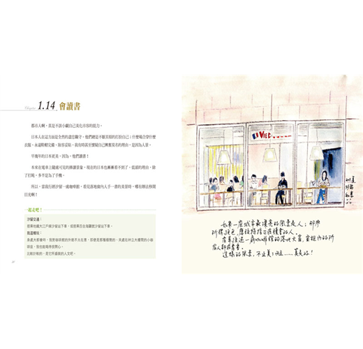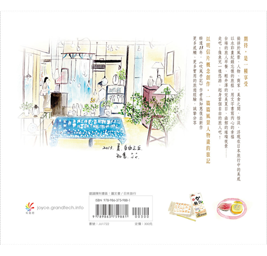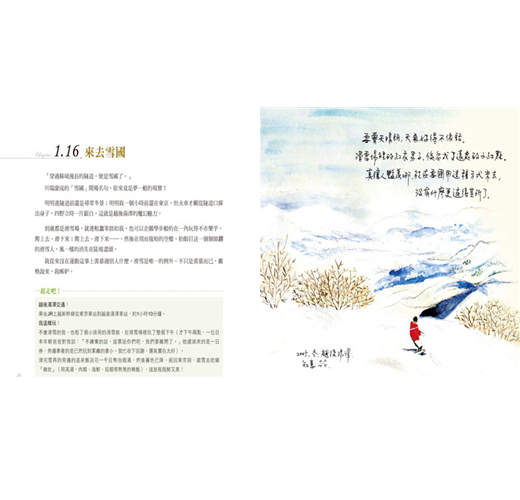 於是,在這本旅誌中,作者除了以一貫細膩的水彩與溫潤的文字,讓台場的旅人早餐、輕井澤的完美夏日、函館的璀璨夜景……在書頁中翩然登場;也紀錄了表參道旁與咖啡車老闆偶遇時,懾服於其不卑不亢的工作態度;在大雪紛飛的小樽,看身邊乘坐人力車旅客的優雅、從容、不跌跤,心中偷偷泛起的微酸滋味……不盡然是粉紅泡泡的旅程,更像是人生,卻也豐富了人生。