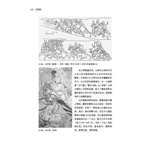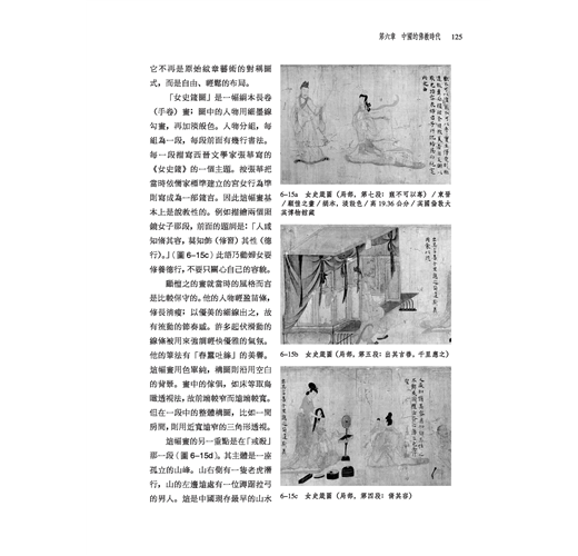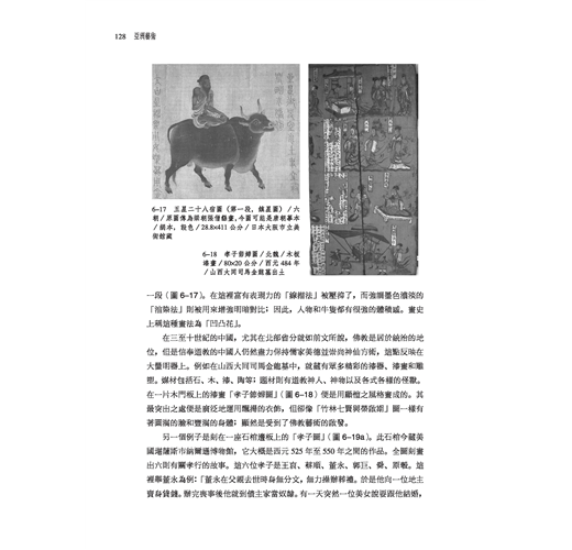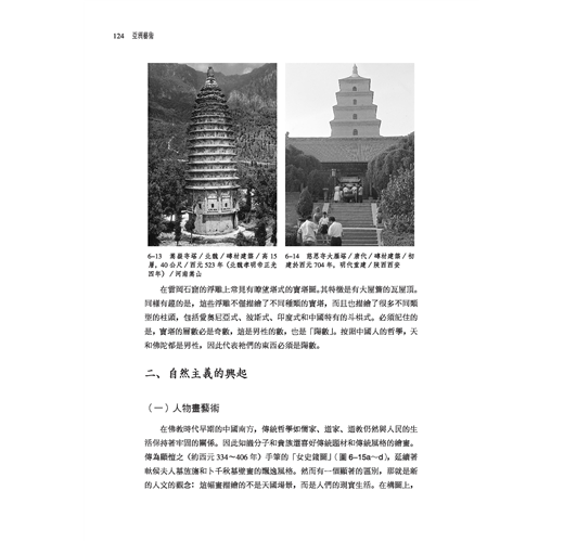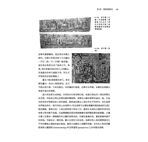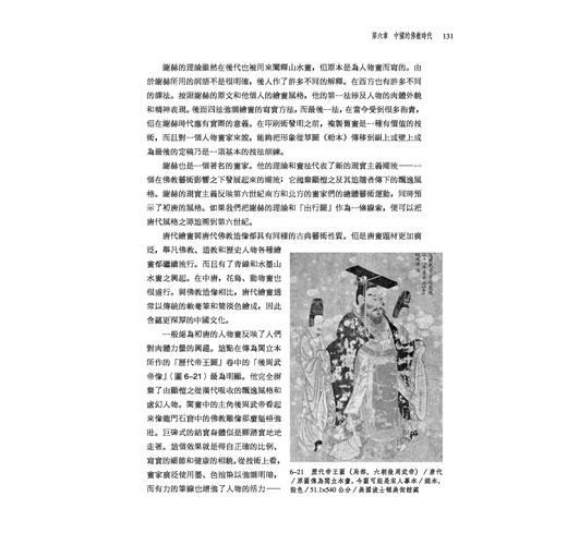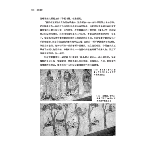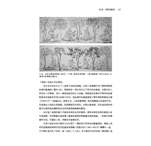 第六章:中國的佛教時代。此章共分三部分。第一部分專論佛教與佛教藝術的傳入和發展。這部分按風格的框架敘述,分為原始型、高古型、修長型、北齊有機型、初唐型、盛唐型、晚唐型等風格。並且討論主要的佛教文化遺址,如敦煌、雲岡、龍門、天龍山等等。第二部分專論有關中國自然主義的興起和世俗繪畫的發展等問題,兼及許多重要畫家,如顧愷之、閻立本、李思訓以及他們的作品。第三部分研究工藝和喪葬藝術等與佛教藝術並行發展的創作。