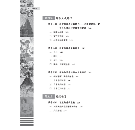 第十二章:中國的綜合主義時代。「綜合主義」作為文化現象充分展現於十三世紀以後的中國。它深入人民生活各個層面。在哲學上主要顯現於儒(人)、釋(神)、道(自然)三種主要思想和它們所代表的藝術觀念的結合。中國文人畫是這種世界觀在藝術上的最佳表現。這個時代包括元、明、清三朝,時間跨度從十四至十九世紀,達五、六百年之久。