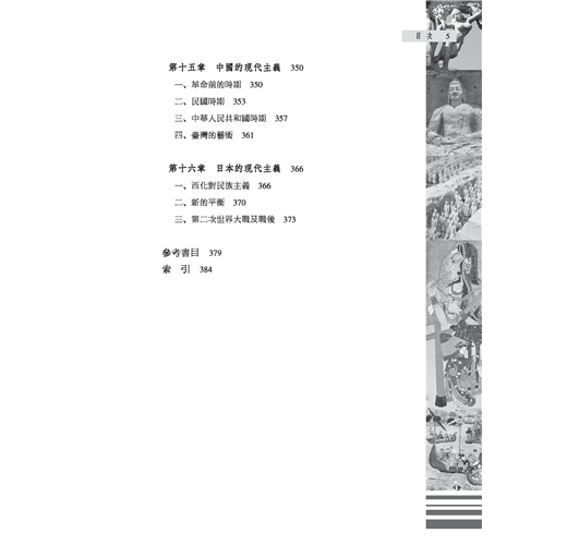 第十五章:中國的現代主義。與其他國家比較,中國有更為強勁的藝術和文化傳統抵抗著外來文化的入侵,而在這期間它也因此更有能力同化外來文化。此章研究中國人為保持民族特性和吸納西方文化所作的努力。