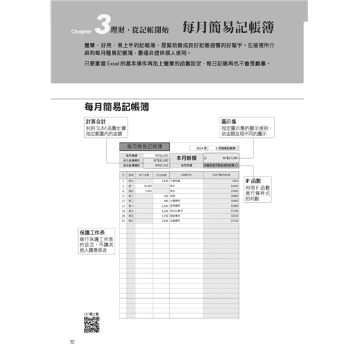 本書除了帶領您認識在執行記帳時的基礎Excel操作技巧外,其中光碟所附的9個主要理財投資表單隨開即用,掌握住Excel的操作概念後,操控一點都不困難。這些表單包括「每月簡易記帳簿」、「年度收支記帳簿」、「基金績效比較表」、「消費日記分類帳」、「消費佔比雷達圖」、「分期貸款試算表」、「定期定額試算表」、「股票買賣管理表」與「個股漲跌分析圖」。