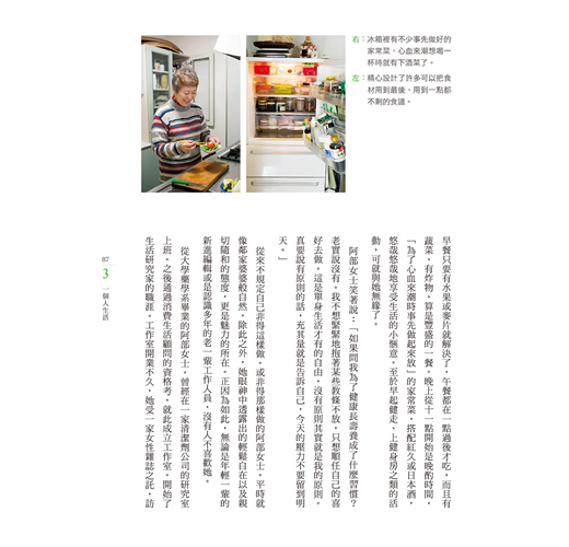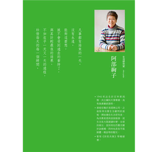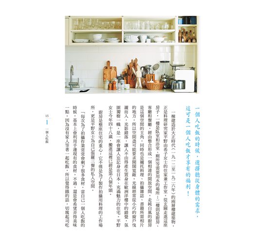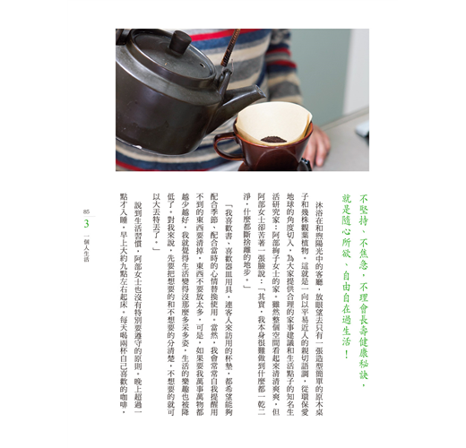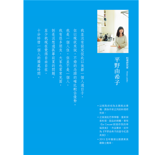讀這本書,讓人無法不驚嘆編輯的巧思。全書的企劃概念相當完整,涵蓋層面廣。從溫馨動人,娓娓道來的生命經驗分享,生活美學的提案與體驗,美好生活從日常各個面向席捲而來,更提出極為實用而細緻,對於未來獨居生活的各種規劃建議。本書是實用貼心的生活寶典。更是在每天過日子的平凡裡,精煉出迷人的品味與美學。