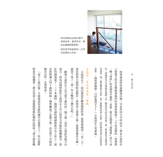 這本書的第二個閱讀的愉悅,在於體會小確幸的心情。日文漢字中的「確幸」,強調設定目標、經歷奮鬥過程後,獲取成果時刻的美好。這樣的心情也可以從這幾位女士的人生奮鬥故事裡看到:例如靠自己的能力,買下土地、存錢興建自己想要的家,安居家中,建構出在家創作的豐富天地;買下老房子,改裝成搭配廚藝工作室與家空間。家與房子之間的親密對話:不再是過去以核心家庭為依歸的唯一一種家想像,這些女性以其對房子的情感,建立起自己的家。