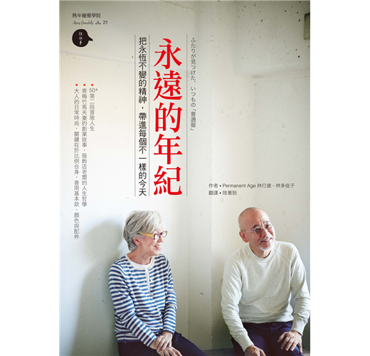 出版人序| 張芳玲〈熟年優雅學院 創辦人〉 永遠都在,小店鋪的幸福──訪 林行雄與林多佳子 《永遠的年紀》日文書名其實是說:「我們日常的時尚──平常穿的普通服,就是最好的打扮」。我想推薦給大家的理由是:現在的熟年世代,比起過去同年齡的人,看起來年輕許多,也有自由的空間創造自己的生活美學,我們可以向作者學習。另外,日本與台灣同樣都經歷從經濟成長高峰走到衰退、平緩的背景,這對夫妻怎樣在五十後拿回生活的自主權,做了開店的決定,一路走到今天,這十六來的工作與生活哲學。 這是一本「大人的日常時尚」穿搭書,但是請千萬別錯過林行雄的不忘初衷與對生活的熱愛,林多佳子俏皮又溫柔的生命回顧。 出版前,我為台灣讀者前往神戶拜會他們夫婦,版面有限,選了幾段對談,分享給你們,更詳盡的訪談內容,可以在網路上找到。 Q 你們個別喜愛本書哪個篇章? 林行雄:<基本款>。一直以來,我們在打扮上,有成功,有失敗,我們年輕時瘋狂地追求流行,但是最後我發現,流行的東西除了少數之外,大部份根本不適合我。今天,我最推薦的就是「基本款單品」,很時尚的人,穿起來就顯得時尚。沒有時尚感的人穿,也會不差。它適合每個人,我可以很放心地推薦。 林多佳子:我喜歡<小小的講究>。年紀大了,皺紋、白髮不要去改變它,畢竟自然是最好的。人要好看,是因為你的好心情、好生活散發出來,加上你「小小講究」的打扮。你在某些細節要有點堅持,就能穿出自己的特色。 林行雄:她這方面真的非常厲害,雖然她穿的都是基本款單品,但是她用眼鏡、項鍊、耳環這些配飾,做出變化和屬於自己的造型。 Q Permanent Age在西元二〇〇〇年創立,隔了十六年,你們對它是否有不同的定義? 林行雄:在本書中有提到Permanent Age是「將永恆不變的精神,放進隨時在改變的新時代」,落實在生活上,就是我們每天日常用的、穿的物品。而且,開一家小店鋪,已經十六年了,感覺我們會「永遠都在此」陪伴著大家。我是越來越肯定「不變、日常」的重要性。 Q 請談談隨著年紀變老,反而更加有意思的事物? 林行雄:我們雖然沒有孩子,但是看見跟我們歲數一樣的人,孩子大了,有越來越多屬於自己的時間,而且經濟也穩定多了,這時候就可以去做年輕時想做卻沒有做的事情、或是造訪想去而沒有去的地方。年輕時,我們因為工作關係,常去歐洲的時尚大城,但現在卻喜歡在國內旅行,或是到不曾去過的國家純度假。我們還會去聽演唱會、日本相聲、舞台劇,甚至比年輕時更熱衷。 林多佳子:還有電影(丈夫猛點頭)。年輕時,我們在家裡看,現在我們去電影院,為了要看大螢幕。 Q 請提供穿搭的建議給五十歲後的大人們。 林多佳子:基本上,顏色和款式不用改變,但是你還是必須買幾件新的衣服,把選購重點放在質料上。年輕時,穿麻和棉比較多,年紀成熟一點,就買些材質好的衣服,像是喀什米爾布料或蠶絲。雖然比較貴,但可以穿很多年。 Q 請談談你十六年前,退出Itional服裝公司的合夥人身份,然後變成一家小店舖經營者的歷程。今天你怎樣看當初的選擇? 林行雄:在那個階段,我們的合夥人希望不斷擴大展店,但是資金變得緊絀,只好增資,讓更多人成為股東,但是我們不願意,因為那樣每年會有更大的業績壓力,設計就只能迎合市場,也意味著我們必須拋開理想,甚至喪失健康。 事業如果要踩煞車,就必須當下做決定,要重頭來過,還來得及!那就是我五十歲時的決心。 我很想告訴四十多歲的人這件事情:以日本為例,平均壽命是八十歲,沒有太多人可以做一份工作,做到八十歲,你要在五十歲之前想清楚這件事:「從五十到八十歲,我要做什麼?」這個問題,年輕時根本不會去想,也沒有足夠的工作歷練可以去找到答案,但是四十之後,你成熟多了,也有足夠的工作歷練,這時就該考慮了。 Q 現在感到自己做對決定了嗎?有意外的收穫嗎? 林行雄:我們取回了生活、健康、自由的時間。更多的是,新的人際關係。當我經營公司時,我沒有在第一線跟客人接觸,開店之後,我們直接接觸客人,有互動,我獲得之前沒有的友情,我稱之為「小店舖的幸福」。