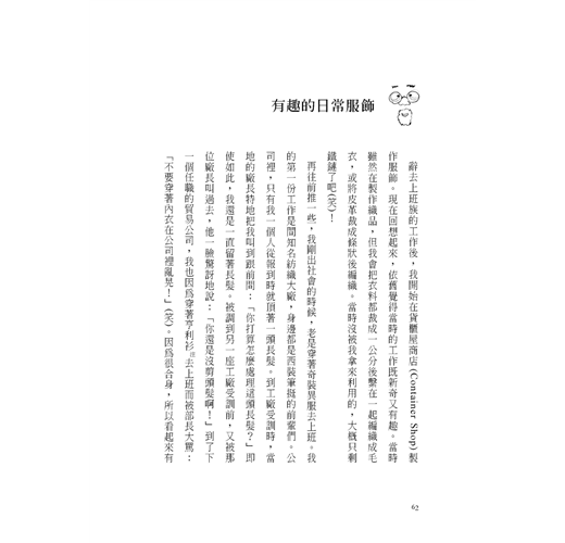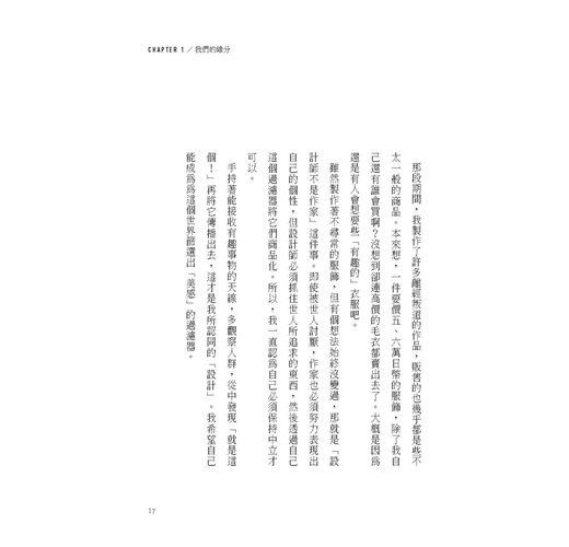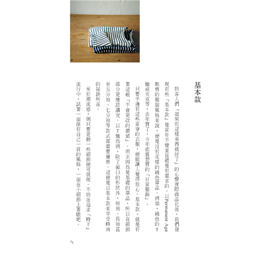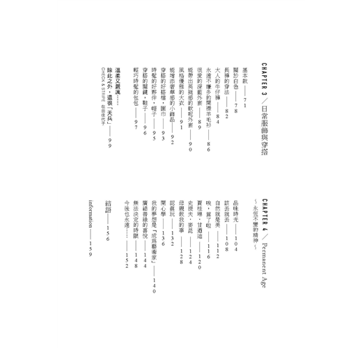 出版人序 作者序 CHAPTER 1 / 我們的緣分 小學時的相遇 走在時尚尖端的時代 向俱樂部的老闆娘學習 我們的店面,誕生 拚命工作 在Itional之後…… 守著一間小服飾店的夫妻 <專欄>只要有中心思想,就不會動搖 CHAPTER 2 / 日常服飾的時尚 適合嗎? 比例平衡的穿搭 「小小的」講究 輕盈的穿著感 服飾是好友 有趣的日常服飾 <專欄>兩人之間 CHAPTER 3 ╱ 日常服飾與穿搭 基本款 關於白色 長褲的穿法 大人的牛仔褲 永遠不嫌多的開襟羊毛衫 很愛的深藍外套 能帶出英挺感的軟呢外套 風格優雅的大衣 能增添奢華感的小飾品 穿搭的好搭檔,圍巾 時髦的好夥伴,帽子 穿搭的關鍵,鞋子 輕巧時髦的包包 <專欄>溫柔又嚴厲……除此之外,還很「天兵」 CHAPTER 4 ╱ Permanent Age ~永恆不變的精神~ 品味時光 該丟就丟 自然就是美 唉,算了啦 賈桂琳‧甘迺迪 史提夫‧麥昆 母親教我的事 認真玩 開心學 我的夢想是「成為藝術家」 廣結善緣的喜悅 無法決定的時限 今後也永遠…… 結語 information