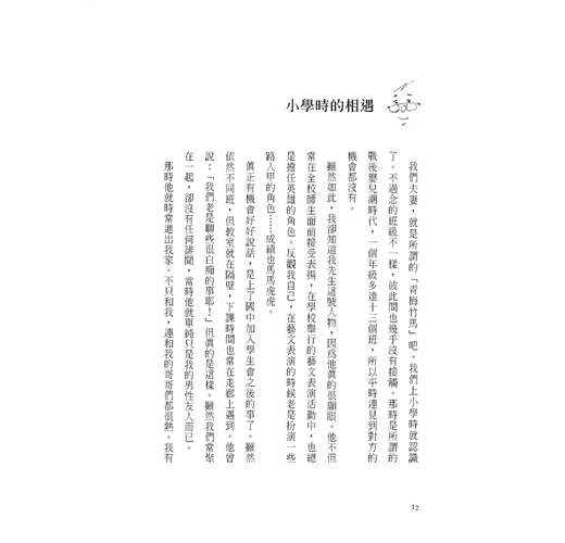 <小學時的相遇>林多佳子 我們夫妻,就是所謂的「青梅竹馬」吧。我們上小學時就認識了。不過念的班級不一樣,彼此間也幾乎沒有接觸。那時是所謂的戰後嬰兒潮時代,一個年級多達十三個班,所以平時連見到對方的機會都沒有。 雖然如此,我卻知道我先生這號人物,因為他真的很顯眼。他不但常在全校師生面前接受表揚,在學校舉行的藝文表演活動中,也總是擔任英雄的角色。反觀我自己,在藝文表演的時候老是扮演一些路人甲的角色……成績也馬馬虎虎。 真正有機會好好說話,是上了國中加入學生會之後的事了。雖然依然不同班,但教室就在隔壁...