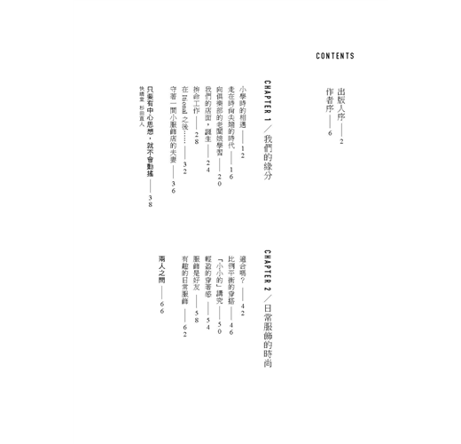 出版人序 作者序 CHAPTER 1 / 我們的緣分 小學時的相遇 走在時尚尖端的時代 向俱樂部的老闆娘學習 我們的店面,誕生 拚命工作 在Itional之後…… 守著一間小服飾店的夫妻 <專欄>只要有中心思想,就不會動搖 CHAPTER 2 / 日常服飾的時尚 適合嗎? 比例平衡的穿搭 「小小的」講究 輕盈的穿著感 服飾是好友 有趣的日常服飾 <專欄>兩人之間 CHAPTER 3 ╱ 日常服飾與穿搭 基本款 關於白色 長褲的穿法 大人的牛仔褲 永遠不嫌多的開襟羊毛衫 很愛的深藍外套 能帶出英挺感的軟呢外套 風格優雅的大衣 能增...