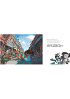 在圖畫中,又然使用了不斷反覆重疊壓克力顏料,製造出類似油畫的立體感,而畫面的視角也有許多變化,俯角的角度像是搭著飛機一樣,俯瞰整個三峽老街,展現三峽不同面向的風貌。每一畫面都有豐富的細節,用色或是構圖都帶有些許華麗又有奇幻的風格。如果你仔細觀察,你會發現,圖像中有許多植物,呈現自然生態的豐富性。而在阿嬤的老厝、或是染缸裡的小精靈,也有許多微小的細節等著讀者來發現喔!