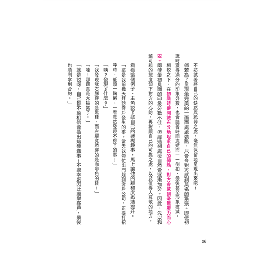 相較之下,在初識時便開誠布公地坦承自己的弱點,對方會感到毫無壓力而心安。即使最初見面的印象分數不佳,但經過相處後自然會逐漸加分。因此,先以和藹可親的態度卸下對方的心防,再彰顯自己的可靠之處,以及值得人尊敬的地方。