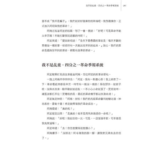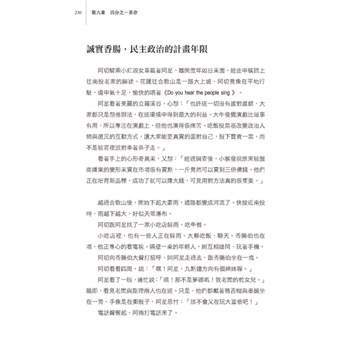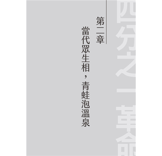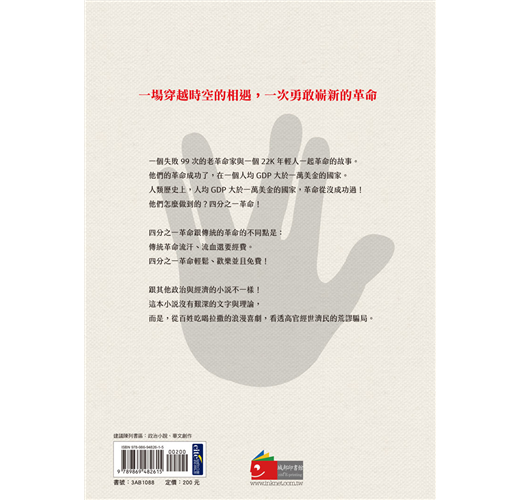 ◎編輯觀點:一本風格獨特的小說,作者以台灣政治現況為體裁,用周星馳的搞笑手法完成這部小說。雖說是充滿搞笑、無俚頭,甚至有點詭異與低俗風格的劇情發展,卻徹底的詮釋屬於今日台灣20至50世代的心聲,讀到某些情節不禁感到有點悲涼。作者不僅創作小說,同時為此寫了一支APP「四分之一革命」,究竟我們能否革命成功,令人期待,也歡迎您的加入!