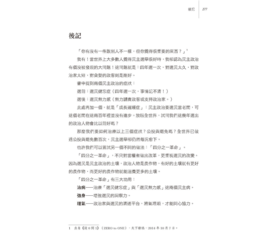 近年來,選舉的結果越來越極端,質疑民主政治的聲音也越來越大。原因是什麼呢?怎麼解呢?《四分之一革命》也許找到原因,並且提供一種簡單有效的解法。