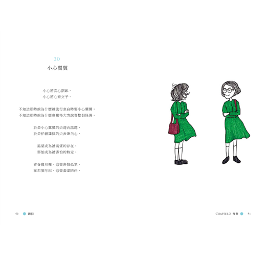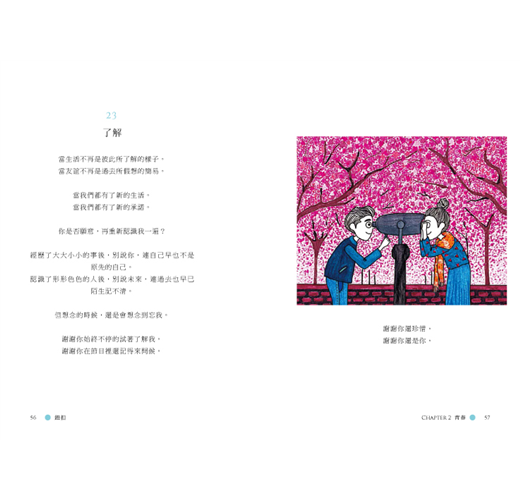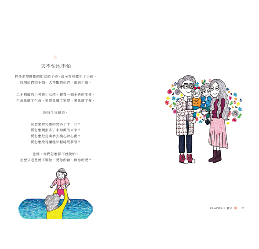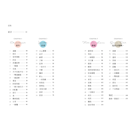本書以時間為軸線,Dorothy繪寫在歲月的上下游各自領悟的風景。沒有長篇大論、老生常談,而是以清新細緻的圖文說了一個個發生在生活中的故事。細細勾勒那些曾錯過、接納、感受、付出的愛。每翻一頁,就有更多的安定、溫暖從心中流淌出來。