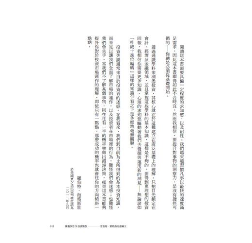 投資失誤通常來自於投資者的迷惑。在我看來,我們到目前為止所得到的基本投資知識,尚未足以讓我們全面了解市場的運作,以及投資者在市場裡的行為。難怪我們會迷惑;也難怪我們會失手。當我們不了解某個事物,則往往有一半的機率會做出錯誤決策。如果這本書能夠提升你對於投資市場運作的理解,即使只有一點點,那麼成功的機率也就會往你的方向傾斜一點點。