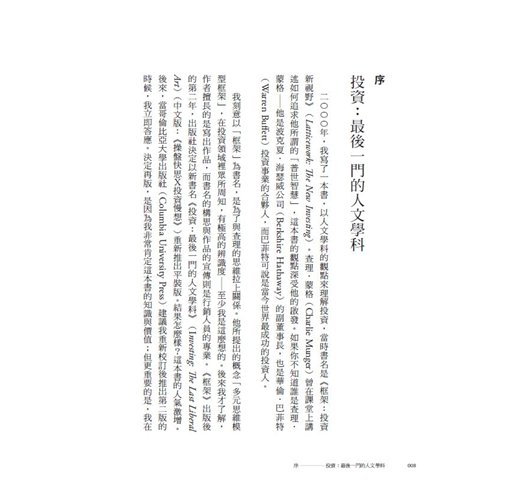 各位必須牢記一件事:這不是一本告訴你如何投資的書。你不可能在其中找到任何教你選股或管理投資組合的逐步指南。然而,讀完之後如果你願意多花些時間思索這些相當具挑戰性的觀點,對於投資你將會有全新的思考方式,對市場與經濟的運作也會有更清晰的了解。這樣的洞察力不是來自經濟學和金融學教科書,而是得自各個似乎並不相關的學科裡所蘊含的基本事實;而這些都是典型的博雅通識教育中所包含的學科。