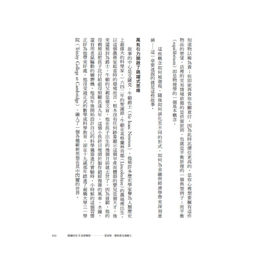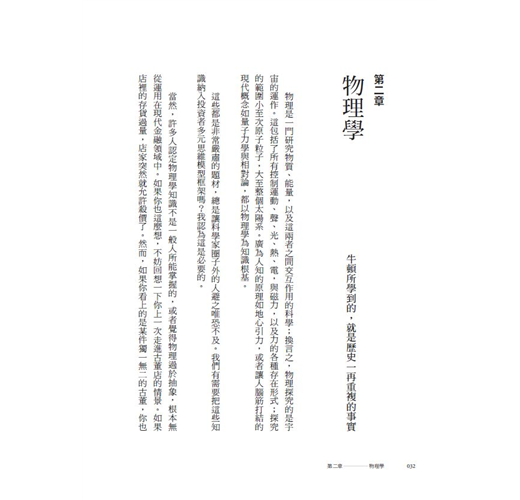 為了建立這樣一種全新的理解,你將會跟著我瀏覽這些學科,探究當中每一個領域的基本核心概念。有時候,我們會從歷史的角度綜覽某個學科,看看該領域的一些概念如何形成、如何發展;然後,我們再來檢視這些概念跟投資市場的關聯。一次閱讀一個章節、進入一個領域,認識一些經得起歷史考驗的偉大思想;我們將從中整合出全新且獨樹一幟的眼光來看待投資。