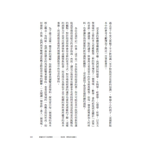 這本書的整體架構維持不變。我們探討物理學、生物學、社會學、心理學、哲學,以及文學領域中主要的心智模型。新的版本增加了一個領域──數學。書的結尾則是關於「決策」的章節。讀過第一版的讀者,將會再次看到當中的許多經典模型,但每一個章節裡新加入的材料,也會讓你得到實質的新知識與新體悟──這也證明了學習是個持續的過程。