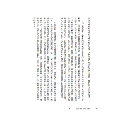 即使如此,許多讀者仍有可能覺得這本書不容易閱讀,挑戰可能不低於我寫作時所面對的。以下兩個層面構成了閱讀的挑戰。第一、某些章節的內容可能來自你所不熟悉的學科,因此讀起來讓你想起大學時期的密集研討班。無論如何,我希望當中的新觀念能夠帶給你一些刺激,讓你值回票價。第二、因為每個章節所呈現的是完全不同的學科領域,所以你或許得讀到最後一頁,才能看清這本書帶給你的好處。這是一個累積的過程,每一個章節都為你帶來一層新的想法。我嘗試點出串連各章節的核心概念,但我的注解無法替代你仔細閱讀與反思後所得到的啟示。