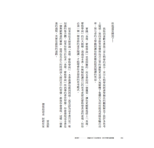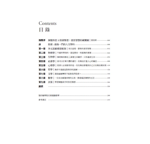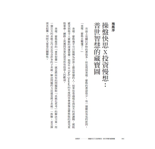 如果你從未探索過「查理.蒙格學說」,本書會讓你感到困惑,甚至認為這本書只是一堆知識的集合體。如果你致力於追求「查理.蒙格學說」所倡導的普世智慧,你會發現這本書是一個無窮無盡的寶庫,值得你花長久的時間深入探討其中的智慧。最後你會發現,這樣一個漸進的過程,其實是最快的道路。