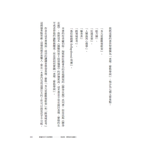 實踐「查理.蒙格學說」是很困難的,而本書如同一個鷹架,讓你更輕鬆地搭上「查理.蒙格學說」的巨大階梯。透過這本書,你無疑能讓自己的思考更接近蒙格想表達的意境,但你必須一個一個章節的逐步閱讀,才能理會作者想談的思考模式。