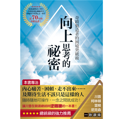 《向上思考的祕密》提供了許多心靈法則,並提醒我們內在心靈的改變,可以內化快樂的能力,也就能夠讓心靈重生,而當心靈力量恢復了,就能調整人生走向積極、正面、喜樂、平靜的面向,接著當然就趕走所有負面的思維了。各位讀者,渴望過著身心健康快樂的日子嗎?渴望在工作前途心想事成嗎?我發現,只要在語言模式、思考模式、行為模式跟著書中的心靈法則來學習,一定可以讓我們改頭換面,創造新的人生局面。──吳娟瑜 國際演說家暨情緒管理專家