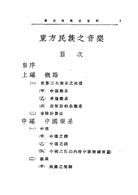 研究各種民族音樂,而加以比較批評。系屬於“比較音樂學”Verglelchende Musikwissenschaft 範圍。此項學問在歐洲方面尚系萌芽時代。故此種材料及不多覯。至於本書取材則係:凡東方各種民族樂制悉以英人A.J.Eills(生於一八一四年,死於一八九○年。對於“比較音樂學”即有貢獻)所著書籍為準。但該書對於東方各種民族音樂,並未悉數網羅。如西藏、蒙古、高麗、安南、土耳其等地,皆附闕如,是也。且書中所述各種民族音樂又悉以樂理方面為限。並未列有作品在內,亦是一個缺點。因此之故。我乃不得不旁採其他各種參考書籍,為之輔助。除中國一篇,係採自中國各種音樂專籍外。其餘如西藏、高麗、安南、波斯、亞刺伯、緬甸等篇,則多採自法國各種書籍。蒙古、日本、爪哇、土耳其、印度、暹羅等篇,則多採自德國各種書籍。又本書體裁;皆係先論樂制,(按即討論“律”與“調”兩個問題)後舉作品。以便讀者對於該族音樂,得著一個明瞭概念。