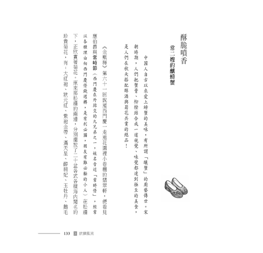 我們還得說說《金瓶梅》裡的飲食,有時光是來幾碟小菜,就有:紅糟蹄子筋、蒜汁豬肉滷、黃芽韭燻驢肉、燉爛鴿子雛兒、美甘甘十香瓜茄、甜孜孜五方豆鼓、香噴噴橘醬、油浸花椒、醋滴苔菜……,真可謂「小菜不小」。於是晚明的時尚藝術、美感造型、宴飲文化,乃至於四季風俗節慶,均已成為人類文明史上難能可貴的珍寶。而書中所有考究的細節描述,與豐富多樣的人情世故,也都值得我們品讀再三,同時令人玩味無窮!