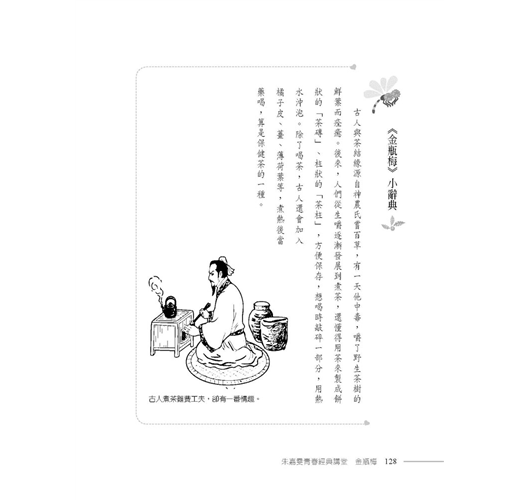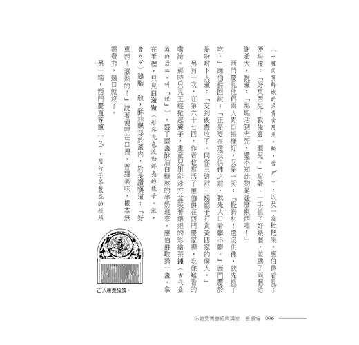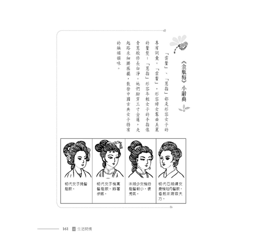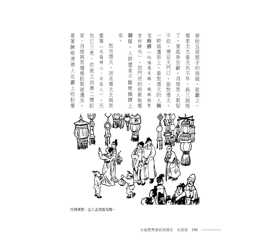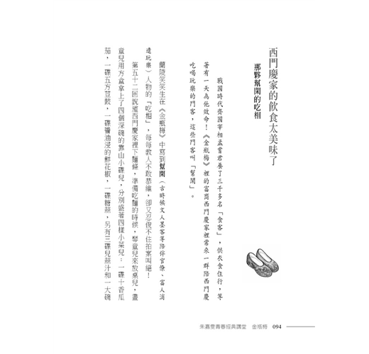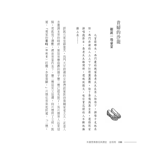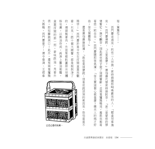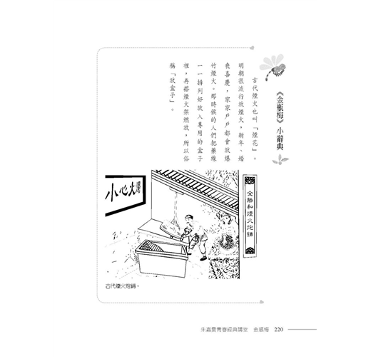 此外,亦配合朱嘉雯教授講《金瓶梅》故事,繪製精美插圖,有古代超時髦的「銅製眼罩」,是時髦男子的「潮」裝備;連食神也愛吃的「裂破頭高裝肉包子」,長啥樣子;古時候女子必備「口紅紙」,一抿,櫻桃小嘴更加紅豔,迷煞人;夏天,生意人也會擺路邊攤賣涼飲,古代版「攤車」長什麼樣子?全文共五十多幅文史插圖,讓喜愛《金瓶梅》的讀者更大飽眼福!