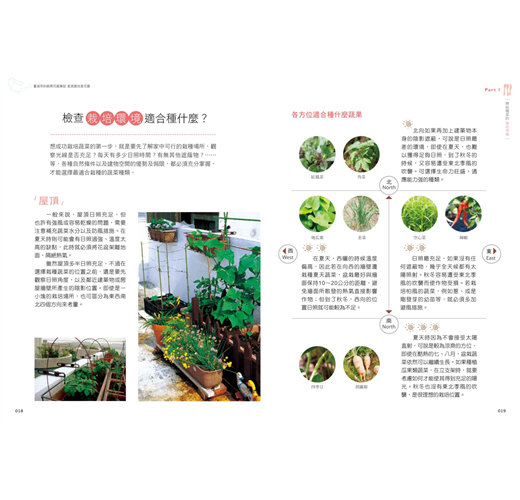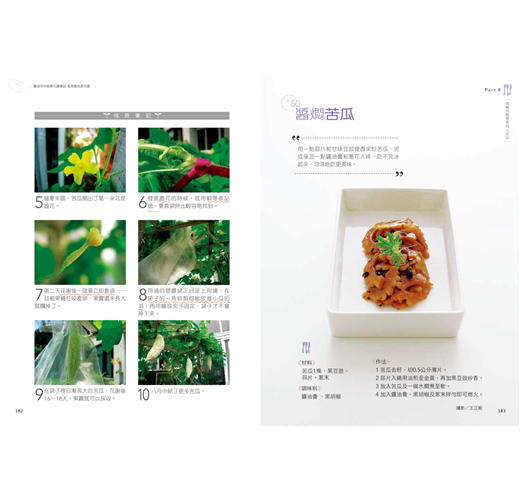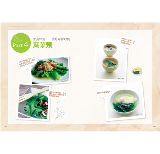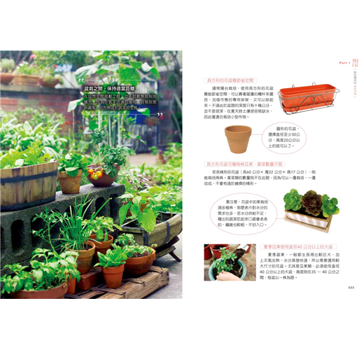 在淑芬的世界中充滿著無限的美麗與歡樂,首章節中就清楚的告訴大家栽種的場所,可以是陽台、露臺、頂樓或庭院,栽種的方式則除了地植外,更可以是美美的各種盆具。可以想像在清晨微風徐徐,與傍晚夕陽下,與親手栽種心愛的蔬菜一起快樂相處的畫面,淑芬就是這樣充滿著生活美感與豐富的實作經驗,並與大家分享這段美好的時光。