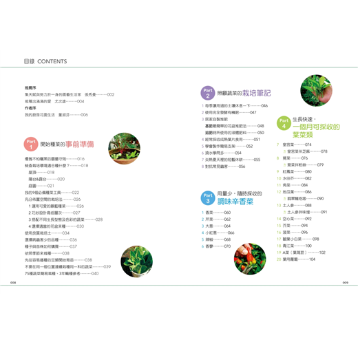 本書中介紹了七十種以上的蔬菜與香草,除了圖文並茂,並做屬性的分門別類與步驟細節的解說,就算是初次接觸栽種的朋友們,也可以經由書中詳細的解說來進行實作。次雄常說:「栽種並不困難,重點在後續的維護與管理。」經由蔬菜特色認識,加上了解其成長的週期,相信可以讓我們更加的喜愛這種自己動手而帶來的實質收穫以及成就感。
