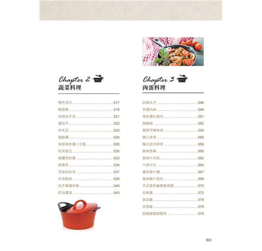 2.依主食材類型區隔。本書將70道美味可口的好料理,依據主要食材分門別類,方便你快速尋找到自己想要的食材。