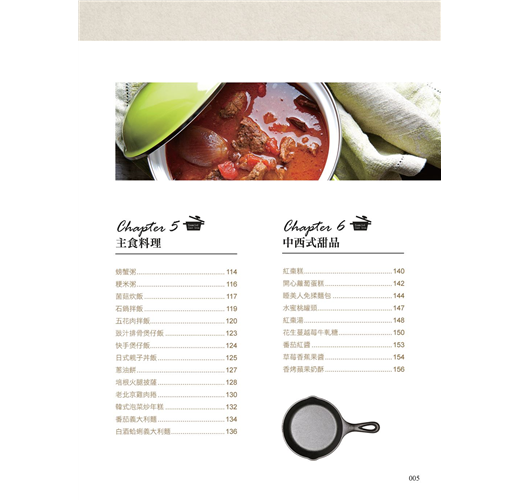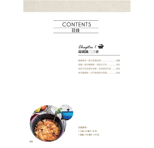初次接觸外形時尚、顏色各異的鑄鐵鍋,以為這是單純作為擺設的裝飾品,不曾想,它竟可製作出如此多且美味的食物。嘗試過後,更是被其用來製作美食的潛力和魅力所深深折服。不管是平時對廚房敬而遠之的新手,還是深陷製作美食樂趣的老手,使用鑄鐵鍋,總能製作出挑逗味蕾的美食。