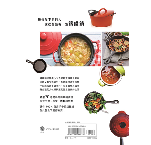 鑄鐵鍋能烹調許多食材和使用不同技法,讓不同口味的讀者都能用鑄鐵鍋做出滿意的食物。對於還在擔心買了鑄鐵鍋卻無從下手的人而言,本書可為您提供不錯的參考。如果您對自己的廚藝有足夠的自信,可以參照本書自創鑄鐵鍋菜譜;如果沒有把握,也無需擔心,本書精選多種鑄鐵鍋中西料理食譜,照著本書做,也能為你的飲食生活增添美味。