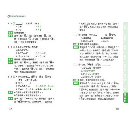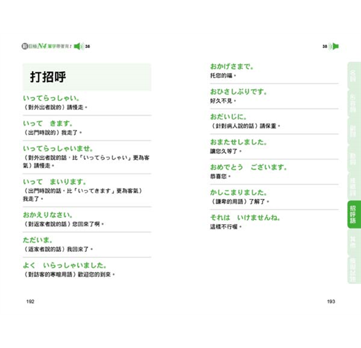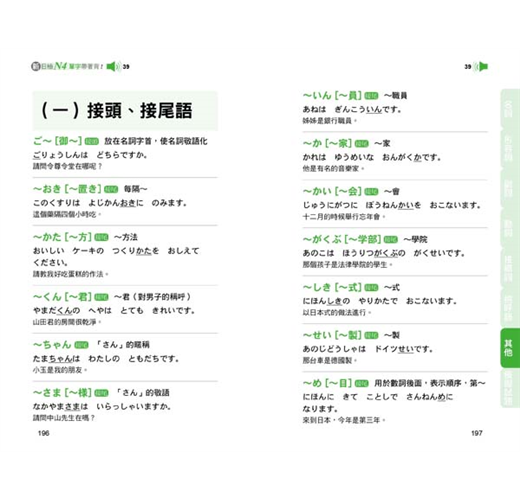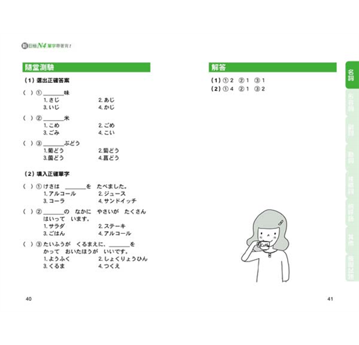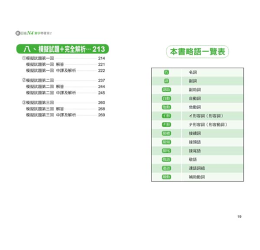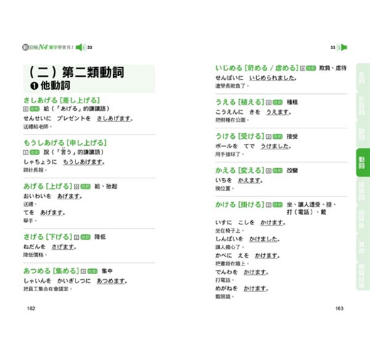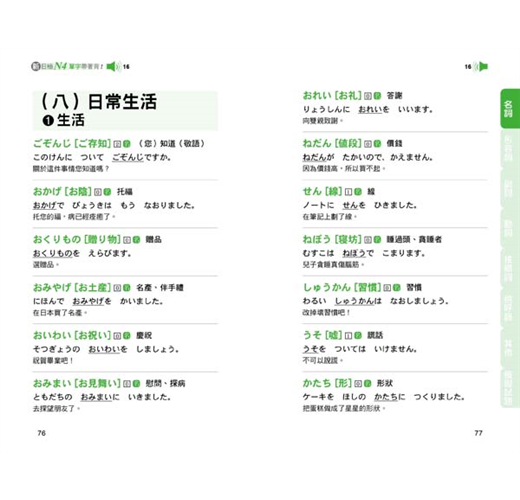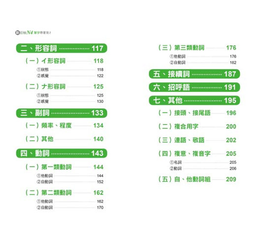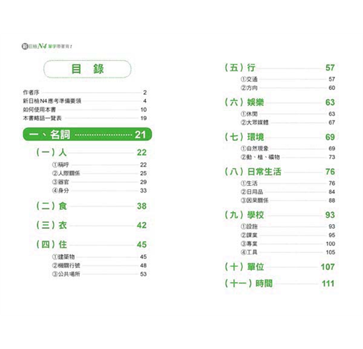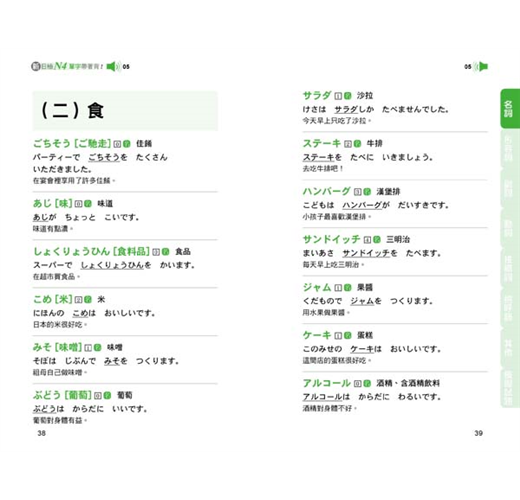 本書將所有N4單字依照詞性的不同分成七大類,分別是「名詞」、「形容詞」、「副詞」、「動詞」、「接續詞」、「招呼語」、「接頭、接尾語‧複合用字‧連語、敬語‧複意、複音字」。接著再在各大類下細分各個小項目,例如「名詞」下可分為:人、食、衣、住、行等等,群組記憶單字,好記不遺漏!