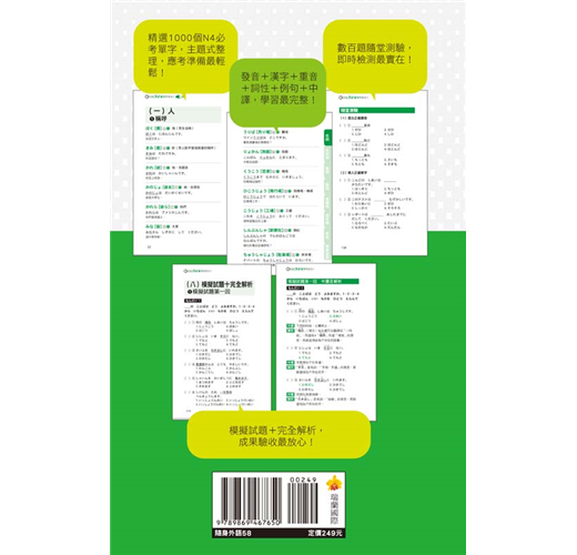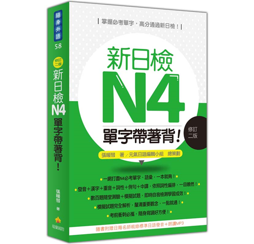 要通過日語檢定,第一步就是要背單字!《新日檢N4單字帶著背! 修訂二版》將N4必考單字一網打盡,運用主題式整理讓您好學好記,還有數百題模擬試題,隨身帶著背,保證高分合格!更依照歷年考題調整收錄單字,保證是最精準的新日檢單字書!
