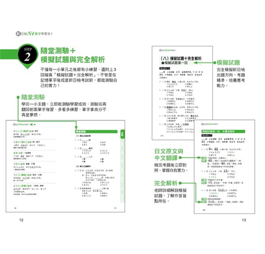 學習完一小類單字後,馬上可以利用緊接在後的「隨堂測驗」,即時檢測學習成效!而全真3回模擬試題,完全依照「日本國際教育支援協會」及「日本國際交流基金會」公布來出題,忠實呈現試題原貌,讓您厚植實力、加強臨場經驗、增加解題速度和功力,保證過關!