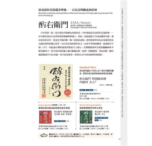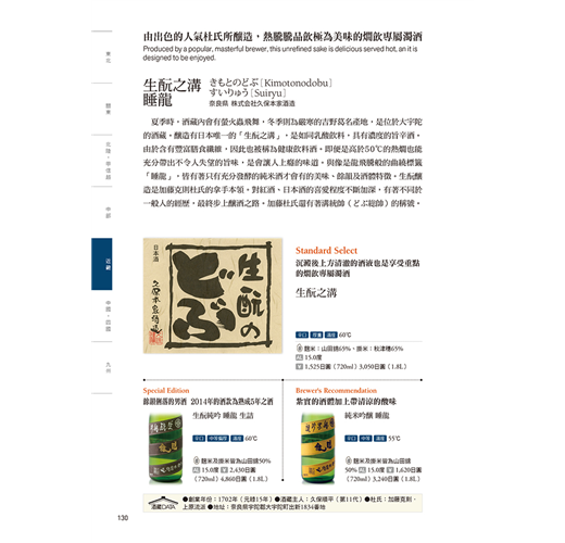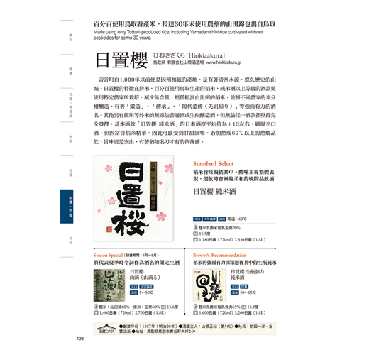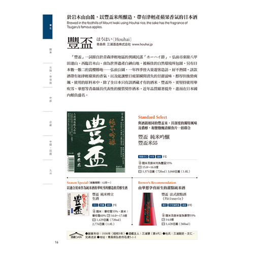 本書介紹的每款酒皆標示酒藏主人推薦的品飲溫度,保證喝下最佳風味!而且,每家酒藏皆會推薦各一款「Standard、Season Special(Edition)、Brewer’s Recommendation」的酒,標示入口的甜‧辣度、酒體口感,酒精濃度與精米比例。完整介紹,專業推薦!